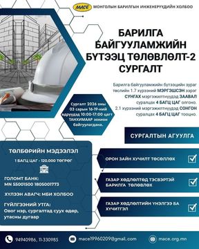 МБИ Холбооноос "Барилга байгууламжийн бүтээц төлөвлөлт-2" буюу 1.7 хүрээний мэргэшсэн зэрэг СУНГАХ мэргэжилтнүүдэд ЗААВАЛ суралцах 4 багц цаг олгох танхимын сургалт зарлаж байна.