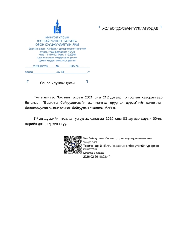 Хот байгуулалт, барилга, орон сууцжуулалтын яамнаас Засгийн газрын 2021 оны 212 дугаар тогтоолын хавсралтаар баталсан "Барилга байгууламжийн ашиглалтад оруулах дүрэм"-ийг шинэчлэн боловсруулах ажил зохион байгуулагдаж санал авахаар албан тоот ирүүлсэн тул холбооны гишүүд дүрмийн төсөлд тусгах саналаа 2026.03.06-ны өдрийн дотор Battsend@mcud.gov.mn цахим хаягаар хүргүүлнэ үү.